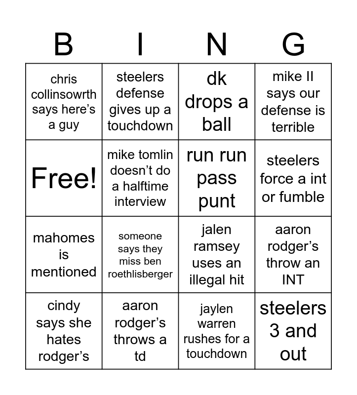 This bingo card has 16 words: aaron rodger’s throws a td, aaron rodger’s throw an INT, dk drops a ball, chris collinsowrth says here’s a guy, mahomes is mentioned, steelers defense gives up a touchdown, jalen ramsey uses an illegal hit, jaylen warren rushes for a touchdown, Free!, mike tomlin doesn’t do a halftime interview, cindy says she hates rodger’s, mike II says our defense is terrible, someone says they miss ben roethlisberger, steelers force a int or fumble, run run pass punt and steelers 3 and out.
