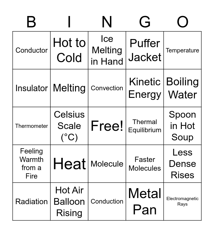 This bingo card has a free space and 25 words: Heat, Conduction, Convection, Radiation, Temperature, Conductor, Insulator, Hot to Cold, Thermal Equilibrium, Molecule, Kinetic Energy, Thermometer, Faster Molecules, Less Dense Rises, Melting, Sun Warming Earth, Spoon in Hot Soup, Ice Melting in Hand, Boiling Water, Celsius Scale (°C), Electromagnetic Rays, Hot Air Balloon Rising, Feeling Warmth from a Fire, Puffer Jacket and Metal Pan.