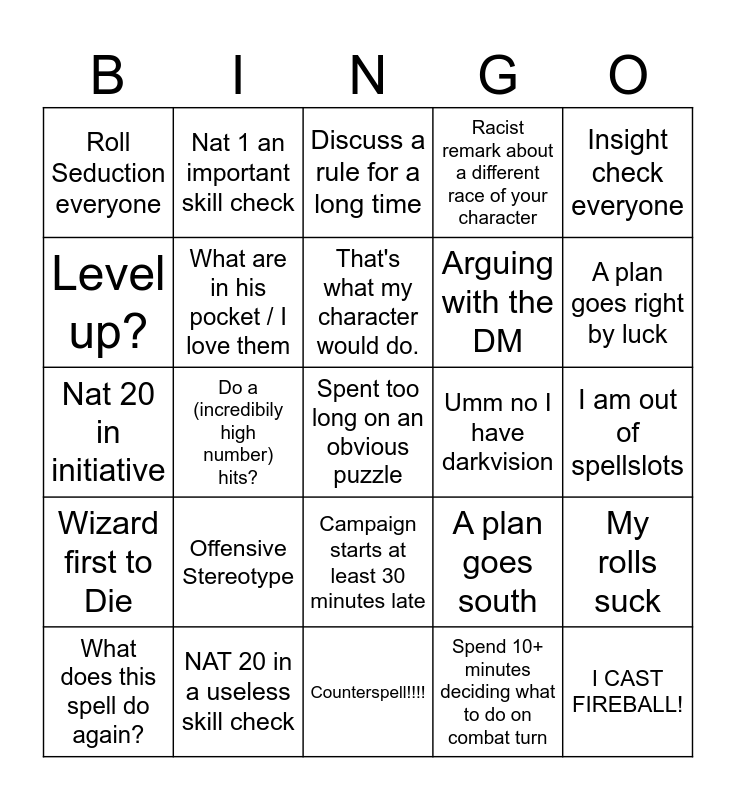 This bingo card has 25 words: Wizard first to Die, NAT 20 in a useless skill check, Spent too long on an obvious puzzle, Spend 10+ minutes deciding what to do on combat turn, Insight check everyone, Roll Seduction everyone, Nat 1 an important skill check, Discuss a rule for a long time, Umm no I have darkvision, My rolls suck, Level up?, What are in his pocket / I love them, Counterspell!!!!, A plan goes south, A plan goes right by luck, What does this spell do again?, Do a (incredibily high number) hits?, That's what my character would do., Arguing with the DM, I am out of spellslots, Nat 20 in initiative, Offensive Stereotype, Campaign starts at least 30 minutes late, Racist remark about a different race of your character and I CAST FIREBALL!.