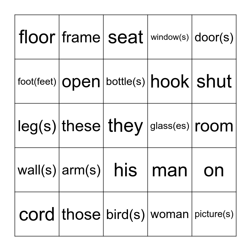This bingo card has 25 words: arm(s), bird(s), bottle(s), cord, door(s), floor, foot(feet), frame, glass(es), his, hook, leg(s), man, on, open, picture(s), room, seat, shut, these, they, those, wall(s), window(s) and woman.