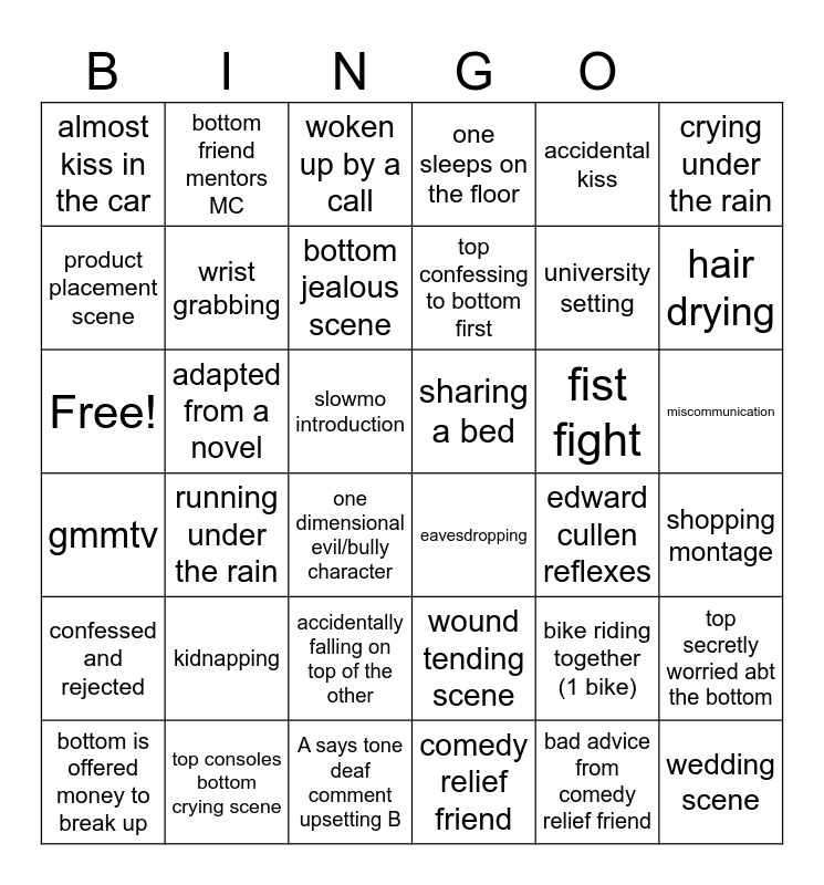 This bingo card has 36 words: wound tending scene, accidentally falling on top of the other, comedy relief friend, product placement scene, gmmtv, sharing a bed, wrist grabbing, A says tone deaf comment upsetting B, accidental kiss, bike riding together (1 bike), hair drying, one sleeps on the floor, top secretly worried abt the bottom, adapted from a novel, top confessing to bottom first, almost kiss in the car, confessed and rejected, fist fight, Free!, woken up by a call, slowmo introduction, running under the rain, eavesdropping, one dimensional evil/bully character, edward cullen reflexes, bottom friend mentors MC, university setting, top consoles bottom crying scene, bottom jealous scene, crying under the rain, wedding scene, bottom is offered money to break up, shopping montage, miscommunication, kidnapping and bad advice from comedy relief friend.