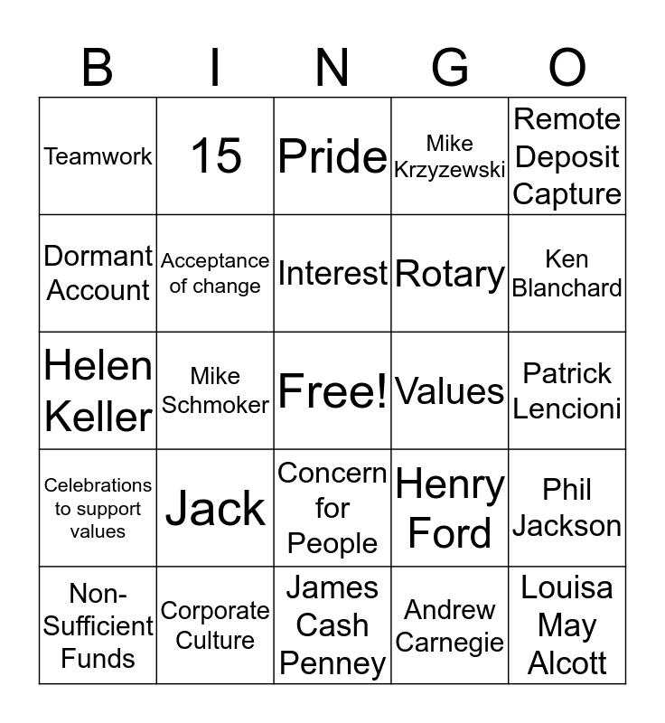 This bingo card has a free space and 24 words: Jack, Corporate Culture, Interest, Non-Sufficient Funds, Remote Deposit Capture, Teamwork, Dormant Account, 15, Values, Concern for People, Rotary, Helen Keller, Henry Ford, Phil Jackson, Acceptance of change, Andrew Carnegie, Patrick Lencioni, Pride, Ken Blanchard, Mike Schmoker, Louisa May Alcott, Celebrations to support values, Mike Krzyzewski and James Cash Penney.