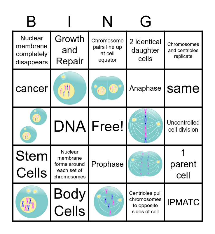 This bingo card has 7 images, a free space and 17 words: Nuclear membrane forms around each set of chromosomes, Centrioles pull chromosomes to opposite sides of cell, Chromosomes and centrioles replicate, Nuclear membrane completely disappears, Growth and Repair, Chromosome pairs line up at cell equator, Uncontrolled cell division, 1 parent cell, cancer, Body Cells, 2 identical daughter cells, same, Stem Cells, DNA, Prophase, Anaphase and IPMATC.