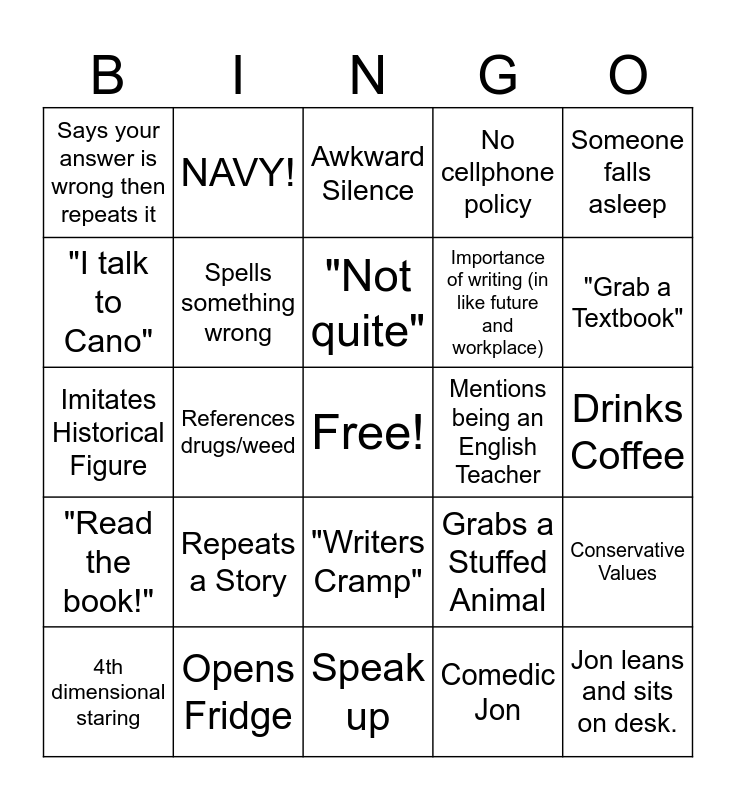 This bingo card has a free space and 34 words: Unrelated story, Comedic Jon, Invades students personal space, "I have a military connection", "Read the book!", Spells something wrong, Someone falls asleep, 4th dimensional staring, NAVY!, Tech Issue, "Not quite", Awkward Silence, "Write that down, write that down!", Mentions being a journalist, Mentions being an English Teacher, "Grab a Textbook", Opens Fridge, Imitates Historical Figure, Repeats a Story, Grabs a Stuffed Animal, "Writers Cramp", Brings up his Uniform, Says your answer is wrong then repeats it, Drinks Coffee, Speak up, Jon leans and sits on desk., No cellphone policy, Check the dictionary, Importance of writing (in like future and workplace), "I talk to Cano", "Thesis is feces", References drugs/weed, Conservative Values and Mentions surgery.
