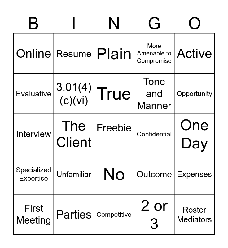 This bingo card has a free space and 29 words: First Meeting, Practical Elements, The Client, Neutral Facilitator, Online, Plain, 3.01(4)(c)(vi), Unfamiliar, Confidential, Parties, One Day, Roster Mediators, Competitive, 2 or 3, Opportunity, Transparent, No, Specialized Expertise, Active, Interview, Outcome, Competence, Tone and Manner, Evaluative, More Amenable to Compromise, Resume, Expenses, True and Quebec.