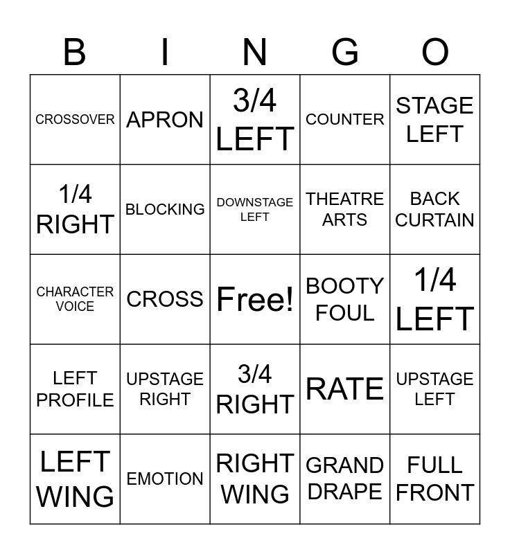 This bingo card has a free space and 37 words: STAGE DIRECTIONS, ACTOR, AUDIENCE, BLOCKING, UPSTAGE LEFT, UPSTAGE RIGHT, DOWNSTAGE LEFT, CENTERSTAGE, STAGE LEFT, STAGE RIGHT, CROSS, COUNTER, FULL FRONT, 1/4 LEFT, 1/4 RIGHT, LEFT PROFILE, RIGHT PROFILE, 3/4 LEFT, 3/4 RIGHT, BOOTY FOUL, CROSSOVER, BACK CURTAIN, LEFT WING, RIGHT WING, LEG, GRAND DRAPE, APRON, HOUSE, PROJECTION, ARTICULATION, TONE, EMOTION, CHARACTER VOICE, PITCH, RATE, THEATRE ARTS and DOWNSTAGE RIGHT.