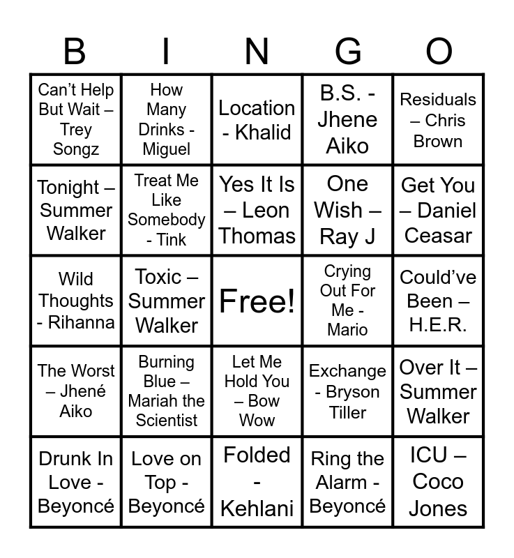 This bingo card has a free space and 24 words: Burning Blue – Mariah the Scientist, Love on Top - Beyoncé, Yes It Is – Leon Thomas, Drunk In Love - Beyoncé, Residuals – Chris Brown, Can’t Help But Wait – Trey Songz, Tonight – Summer Walker, How Many Drinks - Miguel, Crying Out For Me - Mario, Let Me Hold You – Bow Wow, One Wish – Ray J, Wild Thoughts - Rihanna, Exchange - Bryson Tiller, Over It – Summer Walker, Treat Me Like Somebody - Tink, Ring the Alarm - Beyoncé, Could’ve Been – H.E.R., Location - Khalid, Get You – Daniel Ceasar, Toxic – Summer Walker, ICU – Coco Jones, The Worst – Jhené Aiko, B.S. - Jhene Aiko and Folded - Kehlani.