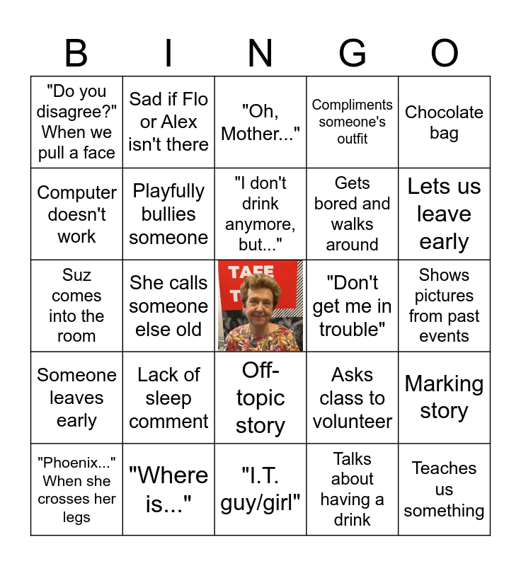 This bingo card has a free space and 26 words: Off-topic story, Talks about having a drink, "I don't drink anymore, but...", "Where is...", Chocolate bag, "Do you disagree?" When we pull a face, Computer doesn't work, Sad if Flo or Alex isn't there, Shows pictures from past events, Asks class to volunteer, Gets bored and walks around, Suz comes into the room, Marking story, "Phoenix..." When she crosses her legs, She calls someone else old, Talks about blind kid/computer screen, Compliments someone's outfit, Someone leaves early, "Oh, Mother...", Teaches us something, Lets us leave early, "I.T. guy/girl", "Don't get me in trouble", Lack of sleep comment, Playfully bullies someone and Brings up the bingo.