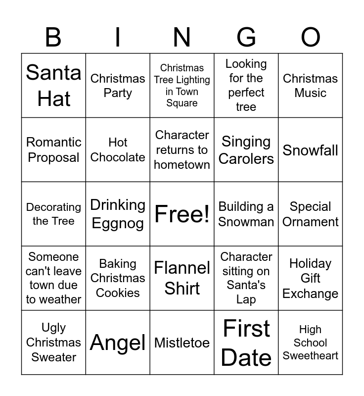 This bingo card has a free space and 24 words: Baking Christmas Cookies, Angel, Character returns to hometown, Ugly Christmas Sweater, Christmas Music, Santa Hat, Romantic Proposal, Christmas Party, Building a Snowman, Flannel Shirt, Singing Carolers, Decorating the Tree, Character sitting on Santa's Lap, Holiday Gift Exchange, Hot Chocolate, First Date, Special Ornament, Christmas Tree Lighting in Town Square, Snowfall, Drinking Eggnog, High School Sweetheart, Someone can't leave town due to weather, Looking for the perfect tree and Mistletoe.