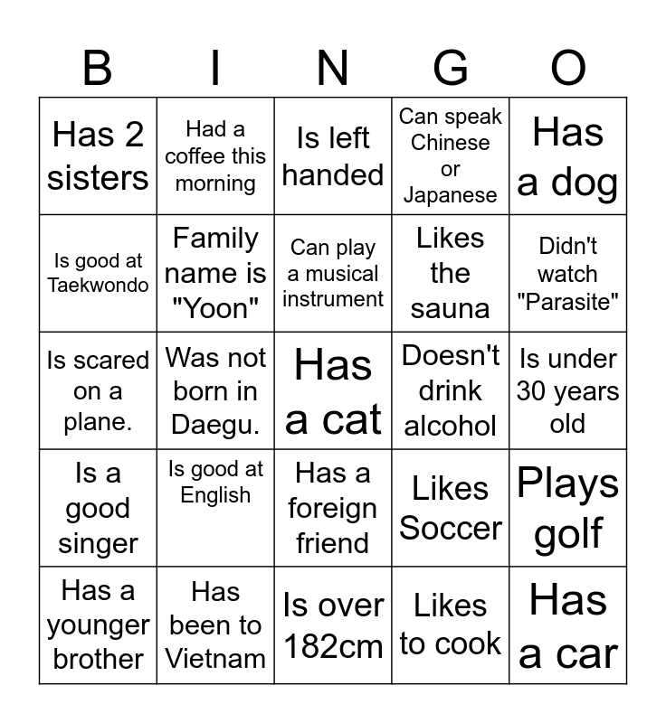 This bingo card has a free space and 24 words: Is good at English, Has been to Vietnam, Can play a musical instrument, Has a younger brother, Has a dog, Has 2 sisters, Is good at Taekwondo, Had a coffee this morning, Doesn't drink alcohol, Has a foreign friend, Likes the sauna, Is scared on a plane., Likes Soccer, Plays golf, Family name is "Yoon", Likes to cook, Is under 30 years old, Is left handed, Didn't watch "Parasite", Was not born in Daegu., Has a car, Is a good singer, Can speak Chinese or Japanese and Is over 182cm.