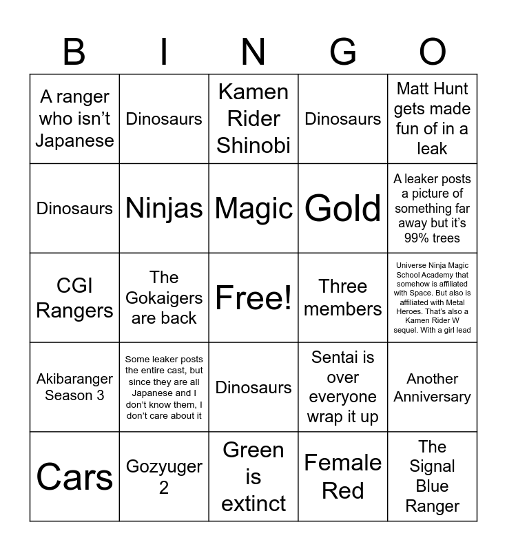 This bingo card has a free space and 29 words: Dinosaurs, Gozyuger 2, Kamen Rider Shinobi, Only 1 girl, Matt Hunt gets made fun of in a leak, A ranger who isn’t Japanese, Ninjas, Magic, Three members, Another Anniversary, Cars, The Gokaigers are back, Female Red, The Signal Blue Ranger, CGI Rangers, Kingohger Green Screen comes back, Green is extinct, Sentai is over everyone wrap it up, A leaker posts a picture of something far away but it’s 99% trees, Akibaranger Season 3, Some leaker posts the entire cast, but since they are all Japanese and I don’t know them, I don’t care about it, Power Rangers posts something before the Sentai 2026 happens. And I think it’s cool, Gold, Universe Ninja Magic School Academy that somehow is affiliated with Space. But also is affiliated with Metal Heroes. That’s also a Kamen Rider W sequel. With a girl lead, Dinosaurs, Dinosaurs, Dinosaurs, Dinosaurs and Dinosaurs.