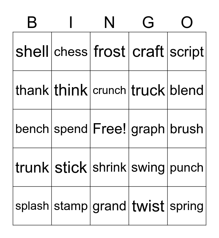 This bingo card has a free space and 25 words: stick, grand, crunch, splash, script, shell, thank, chess, graph, shrink, truck, bench, swing, punch, think, splash, brush, frost, blend, spend, spring, stamp, trunk, craft and twist.