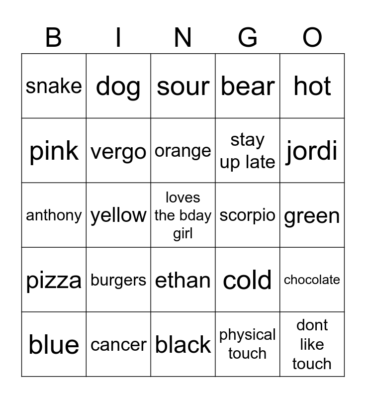 This bingo card has a free space and 28 words: chocolate, go to bed early, stay up late, physical touch, pink, sour, dog, pizza, scorpio, blue, anthony, bear, cancer, black, jordi, cat, burgers, vergo, orange, ethan, snake, chinese, dont like touch, yellow, green, cold, hot and nither hot or cold.