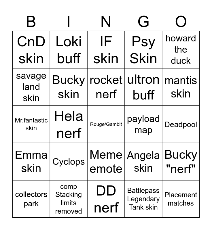 This bingo card has a free space and 24 words: collectors park, Cyclops, rocket nerf, Battlepass Legendary Tank skin, howard the duck, CnD skin, Loki buff, IF skin, payload map, Deadpool, Mr.fantastic skin, Bucky skin, Angela skin, Bucky "nerf", savage land skin, comp Stacking limits removed, DD nerf, Psy Skin, mantis skin, Emma skin, Hela nerf, Meme emote, ultron buff and Placement matches.