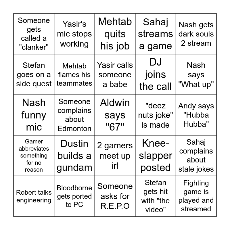 This bingo card has 25 words: Dustin builds a gundam, Someone asks for R.E.P.O, Yasir calls someone a babe, Robert talks engineering, Nash gets dark souls 2 stream, Someone gets called a "clanker", Stefan goes on a side quest, Yasir's mic stops working, "deez nuts joke" is made, 2 gamers meet up irl, DJ joins the call, Nash funny mic, Knee-slapper posted, Sahaj complains about stale jokes, Mehtab flames his teammates, Fighting game is played and streamed, Andy says "Hubba Hubba", Mehtab quits his job, Nash says "What up", Someone complains about Edmonton, Aldwin says "67", Bloodborne gets ported to PC, Gamer abbreviates something for no reason, Sahaj streams a game and Stefan gets hit with "the video".