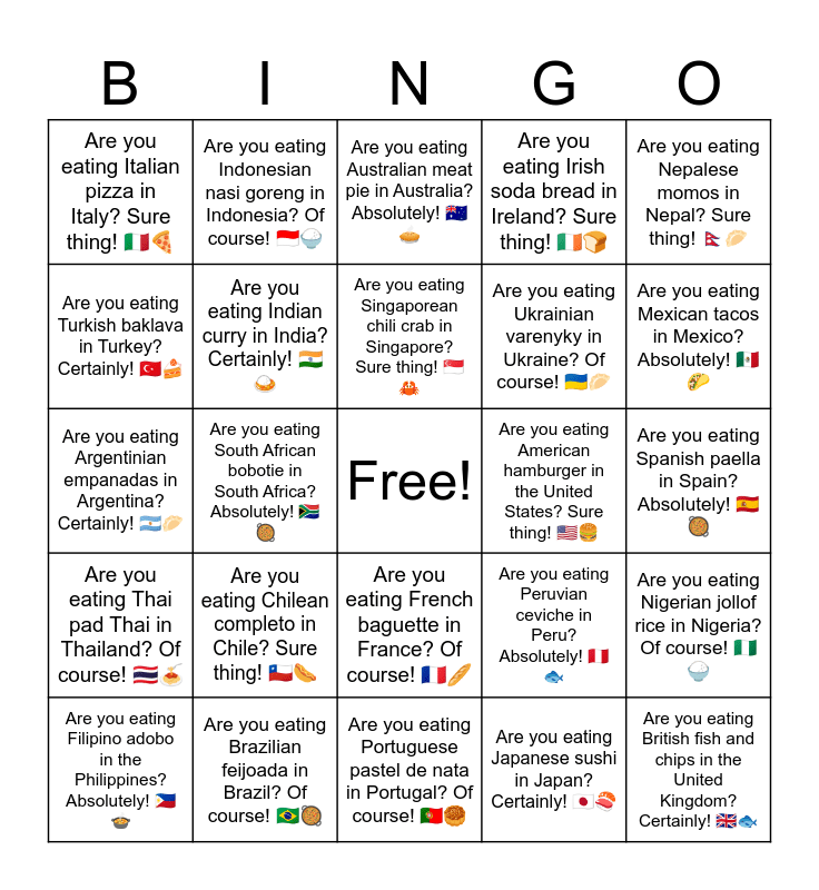 This bingo card has a free space and 34 words: Are you eating Korean kimchi in Korea? Of course! 🇰🇷🥬, Are you eating Japanese sushi in Japan? Certainly! 🇯🇵🍣, Are you eating Chinese dumplings in China? Sure thing! 🇨🇳🥟, Are you eating Vietnamese pho in Vietnam? Absolutely! 🇻🇳🍜, Are you eating Thai pad Thai in Thailand? Of course! 🇹🇭🍝, Are you eating Indian curry in India? Certainly! 🇮🇳🍛, Are you eating Nepalese momos in Nepal? Sure thing! 🇳🇵🥟, Are you eating Filipino adobo in the Philippines? Absolutely! 🇵🇭🍲, Are you eating Indonesian nasi goreng in Indonesia? Of course! 🇮🇩🍚, Are you eating Malaysian laksa in Malaysia? Certainly! 🇲🇾🥢, Are you eating Singaporean chili crab in Singapore? Sure thing! 🇸🇬🦀, Are you eating Australian meat pie in Australia? Absolutely! 🇦🇺🥧, Are you eating New Zealander pavlova in New Zealand? Of course! 🇳🇿🍰, Are you eating Canadian poutine in Canada? Certainly! 🇨🇦🍟, Are you eating American hamburger in the United States? Sure thing! 🇺🇸🍔, Are you eating Mexican tacos in Mexico? Absolutely! 🇲🇽🌮, Are you eating Brazilian feijoada in Brazil? Of course! 🇧🇷🥘, Are you eating Argentinian empanadas in Argentina? Certainly! 🇦🇷🥟, Are you eating Chilean completo in Chile? Sure thing! 🇨🇱🌭, Are you eating Peruvian ceviche in Peru? Absolutely! 🇵🇪🐟, Are you eating French baguette in France? Of course! 🇫🇷🥖, Are you eating German pretzel in Germany? Certainly! 🇩🇪🥨, Are you eating Italian pizza in Italy? Sure thing! 🇮🇹🍕, Are you eating Spanish paella in Spain? Absolutely! 🇪🇸🥘, Are you eating Portuguese pastel de nata in Portugal? Of course! 🇵🇹🥮, Are you eating British fish and chips in the United Kingdom? Certainly! 🇬🇧🐟, Are you eating Irish soda bread in Ireland? Sure thing! 🇮🇪🍞, Are you eating Russian borscht in Russia? Absolutely! 🇷🇺🥣, Are you eating Ukrainian varenyky in Ukraine? Of course! 🇺🇦🥟, Are you eating Turkish baklava in Turkey? Certainly! 🇹🇷🍰, Are you eating Egyptian koshari in Egypt? Sure thing! 🇪🇬🍲, Are you eating South African bobotie in South Africa? Absolutely! 🇿🇦🥘, Are you eating Nigerian jollof rice in Nigeria? Of course! 🇳🇬🍚 and Are you eating Saudi Arabian kabsa in Saudi Arabia? Certainly! 🇸🇦🍛.
