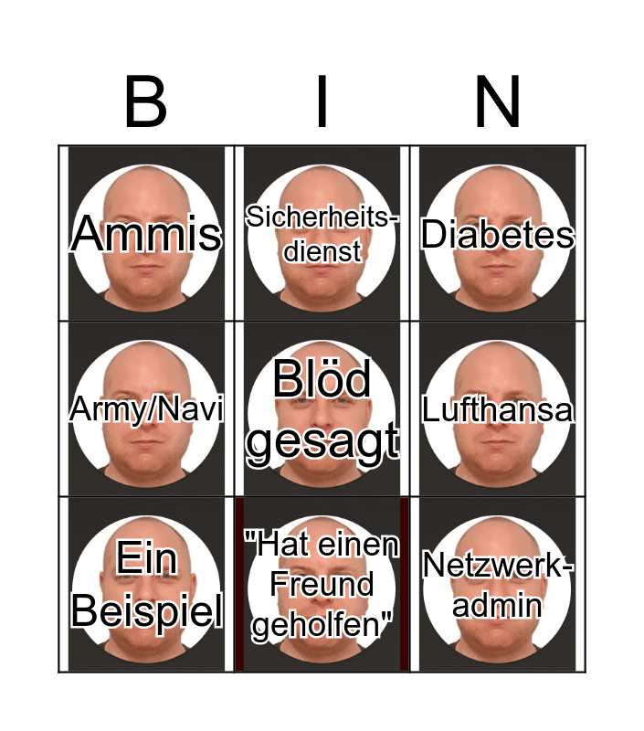 This bingo card has 9 images and 9 words: Ein Beispiel, Diabetes, Sicherheits- dienst, Army/Navi, Ammis, Lufthansa, Blöd gesagt, Netzwerk-admin and "Hat einen Freund geholfen".