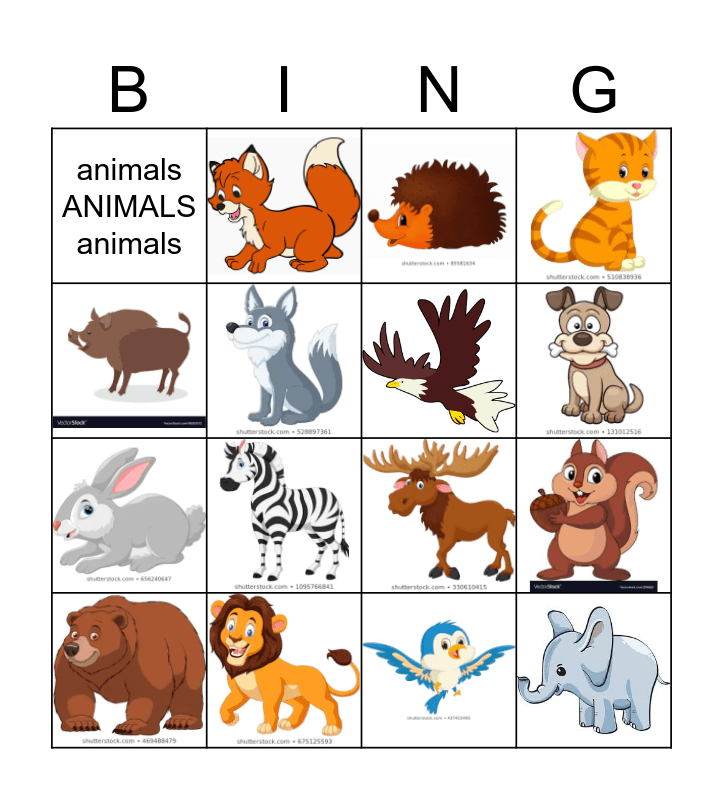This bingo card has 15 images and 1 words: animals ANIMALS animals.