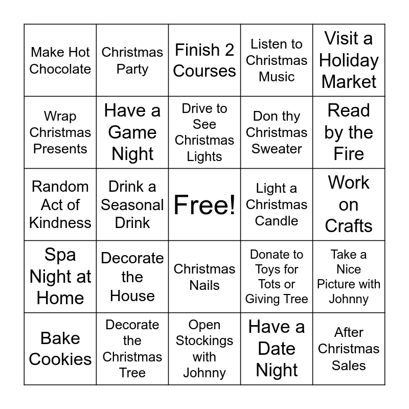 This bingo card has a free space and 24 words: Decorate the House, Decorate the Christmas Tree, Drive to See Christmas Lights, Bake Cookies, Visit a Holiday Market, Make Hot Chocolate, Wrap Christmas Presents, Christmas Party, Light a Christmas Candle, Christmas Nails, Don thy Christmas Sweater, Random Act of Kindness, Donate to Toys for Tots or Giving Tree, Take a Nice Picture with Johnny, Have a Game Night, Have a Date Night, Work on Crafts, Finish 2 Courses, Read by the Fire, Drink a Seasonal Drink, After Christmas Sales, Spa Night at Home, Listen to Christmas Music and Open Stockings with Johnny.