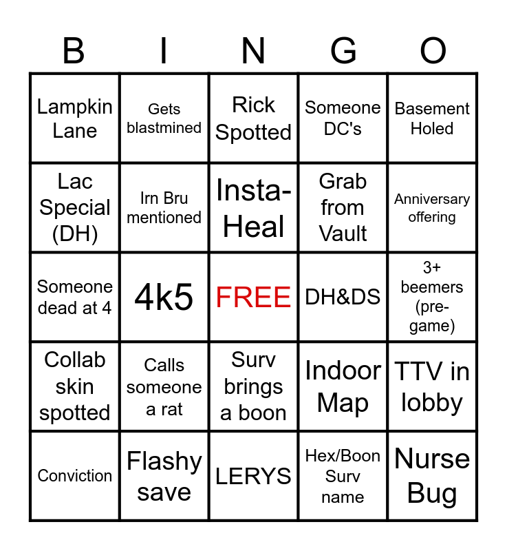 This bingo card has a free space and 50 words: Whiff, Nurse Bug, Cheryl Spotted, LERYS, Calls someone a rat, Toba, Gets blastmined, Surv gives Lac a gift, Lac Special (DH), Salt in stream, Irn Bru mentioned, Someone DC's, TTV in lobby, Indoor Map, Ace spotted, Gets t-bagged, Insta-Heal, DH&DS, Coldwind, Basement Holed, 4k5, Hex/Boon Surv name, Lampkin Lane, Grab from Vault, Successful DH, Value from all 4 perks, Anniversary offering, Lac gets stuck on environment, Rick Spotted, Surv brings a boon, P400 team, End game Salt, DBD related simp name, Failed pallet save, Flashy save, Dead Dawg Saloon, Ste-gull Spotted, Calls someone a minge, Licenced lobby, 3+ beemers (pre-game), Lac's hatch magnet, Leon spotted, Trickster mentioned, Lithe brain, Conviction, Someone dead at 4, Kicks 5+ gens in 1 game, Alert jump scare, Collab skin spotted and Lac wants to adopt a surv.