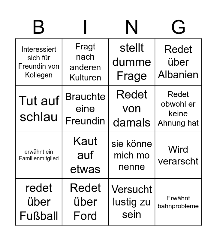 This bingo card has 16 words: Redet über Ford, Wird verarscht, stellt dumme Frage, Interessiert sich für Freundin von Kollegen, erwähnt ein Familienmitglied, Fragt nach anderen Kulturen, sie könne mich mo nenne, Versucht lustig zu sein, Tut auf schlau, Brauchte eine Freundin, redet über Fußball, Redet über Albanien, Kaut auf etwas, Redet obwohl er keine Ahnung hat, Redet von damals and Erwähnt bahnprobleme.