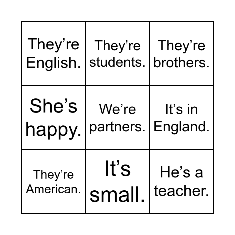 This bingo card has 24 words: They’re teachers., They’re blue., It’s small., He’s a student., We’re partners., They’re English., It’s in England., They’re students., They’re friends., She’s a student., He’s a teacher., They’re in my class., They’re Spanish., She’s English., They’re American., She’s a teacher., It’s big., They’re brothers., We’re friends., It’s red., He’s American., They’re in the library., She’s happy. and He’s tired..