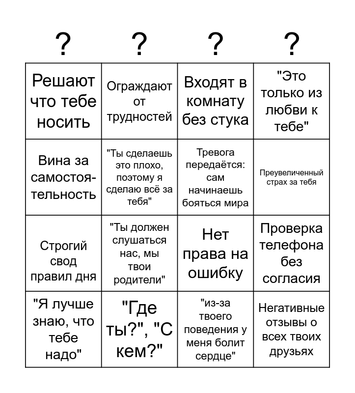 This bingo card has 16 words: "Где ты?", "С кем?", Проверка телефона без согласия, Входят в комнату без стука, Решают что тебе носить, Строгий свод правил дня, Ограждают от трудностей, Нет права на ошибку, "из-за твоего поведения у меня болит сердце", Вина за самостоя- тельность, "Ты сделаешь это плохо, поэтому я сделаю всё за тебя", "Я лучше знаю, что тебе надо", "Это только из любви к тебе", "Ты должен слушаться нас, мы твои родители", Преувеличенный страх за тебя, Тревога передаётся: сам начинаешь бояться мира and Негативные отзывы о всех твоих друзьях.
