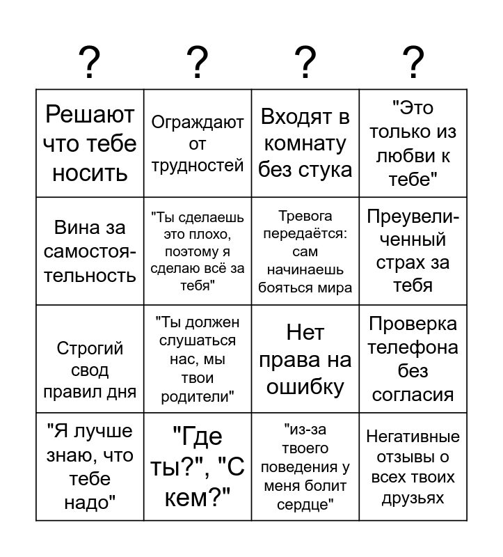 This bingo card has 16 words: "Где ты?", "С кем?", Проверка телефона без согласия, Входят в комнату без стука, Решают что тебе носить, Строгий свод правил дня, Ограждают от трудностей, Нет права на ошибку, "из-за твоего поведения у меня болит сердце", Вина за самостоя- тельность, "Ты сделаешь это плохо, поэтому я сделаю всё за тебя", "Я лучше знаю, что тебе надо", "Это только из любви к тебе", "Ты должен слушаться нас, мы твои родители", Преувели- ченный страх за тебя, Тревога передаётся: сам начинаешь бояться мира and Негативные отзывы о всех твоих друзьях.
