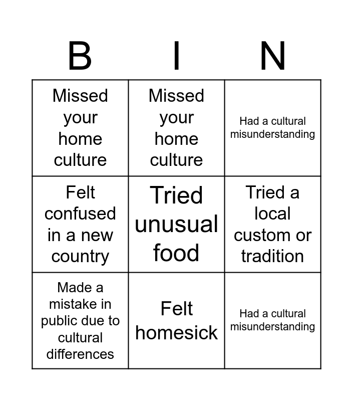 This bingo card has a free space and 17 words: Surprised by public behavior, Felt homesick, Had a cultural misunderstanding, Missed your home culture, Experienced language barriers, Felt confused in a new country, Tried a local custom or tradition, Made a mistake in public due to cultural differences, Felt homesick, Tried a local custom or tradition, Experienced language barriers, Tried unusual food, Had a cultural misunderstanding, Missed your home culture, Made a mistake in public due to cultural differences, Felt confused in a new country and Surprised by public behavior.