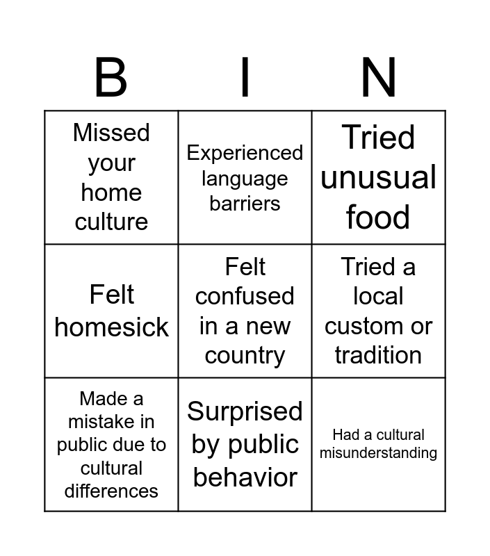 This bingo card has 9 words: Made a mistake in public due to cultural differences, Felt confused in a new country, Tried unusual food, Missed your home culture, Experienced language barriers, Tried a local custom or tradition, Felt homesick, Surprised by public behavior and Had a cultural misunderstanding.