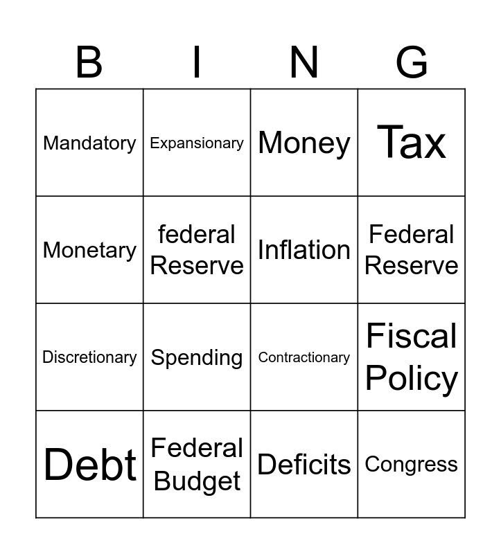 This bingo card has 16 words: Federal Budget, Fiscal Policy, Money, Mandatory, Discretionary, Expansionary, Contractionary, Deficits, Monetary, federal Reserve, Debt, Tax, Spending, Federal Reserve, Inflation and Congress.