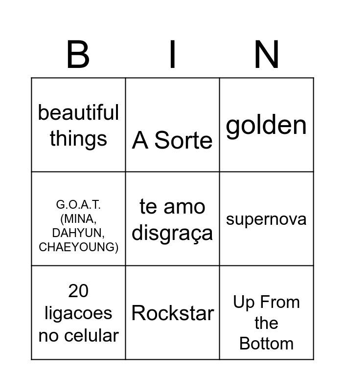 This bingo card has a free space and 8 words: supernova, golden, A Sorte, 20 ligacoes no celular, beautiful things, Up From the Bottom, G.O.A.T. (MINA, DAHYUN, CHAEYOUNG) and Rockstar.