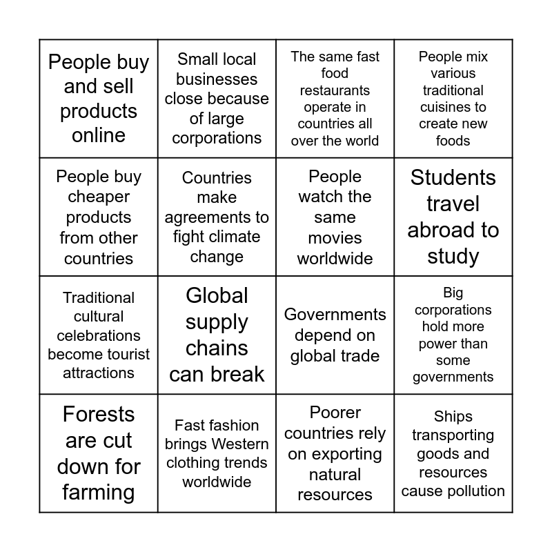 This bingo card has 20 words: Big corporations hold more power than some governments, Local and indigenouse languages start to die out, The same fast food restaurants operate in countries all over the world, Factories move to countries with lower wages, Forests are cut down for farming, People buy cheaper products from other countries, Fast fashion brings Western clothing trends worldwide, People buy and sell products online, Traditional cultural celebrations become tourist attractions, Small local businesses close because of large corporations, Global supply chains can break, Governments depend on global trade, Countries make agreements to fight climate change, Ships transporting goods and resources cause pollution, People watch the same movies worldwide, People feel a loss of national identity, Students travel abroad to study, People mix various traditional cuisines to create new foods, Poorer countries rely on exporting natural resources and Global crises spread quickly.