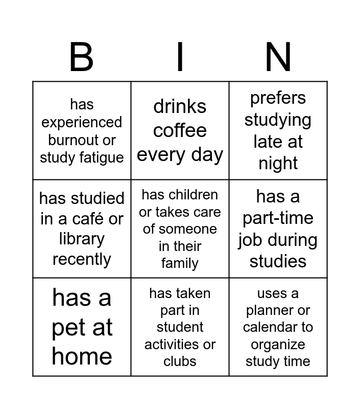 This bingo card has a free space and 8 words: has a part-time job during studies, prefers studying late at night, drinks coffee every day, has a pet at home, has experienced burnout or study fatigue, uses a planner or calendar to organize study time, has studied in a café or library recently and has taken part in student activities or clubs.