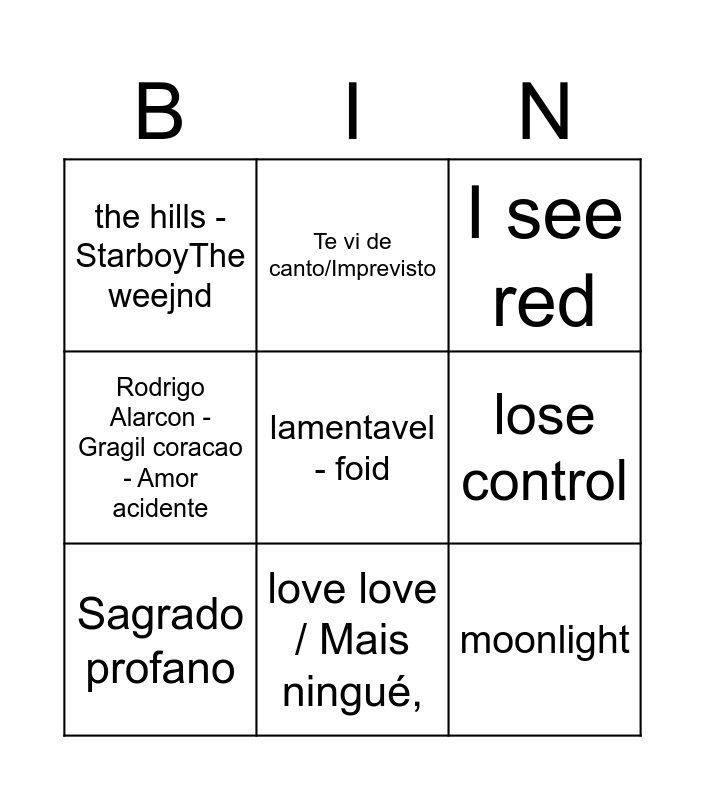 This bingo card has a free space and 8 words: lose control, I see red, Te vi de canto/Imprevisto, Sagrado profano, the hills - StarboyThe weejnd, moonlight, Rodrigo Alarcon - Gragil coracao - Amor acidente and love love / Mais ningué,.