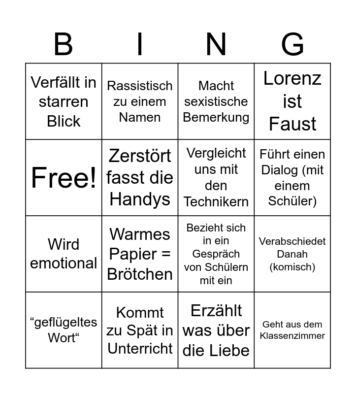 This bingo card has 16 words: Kommt zu Spät in Unterricht, Verabschiedet Danah (komisch), Macht sexistische Bemerkung, Verfällt in starren Blick, Wird emotional, Rassistisch zu einem Namen, Bezieht sich in ein Gespräch von Schülern mit ein, Erzählt was über die Liebe, Free!, Zerstört fasst die Handys, “geflügeltes Wort“, Lorenz ist Faust, Warmes Papier = Brötchen, Führt einen Dialog (mit einem Schüler), Vergleicht uns mit den Technikern and Geht aus dem Klassenzimmer.