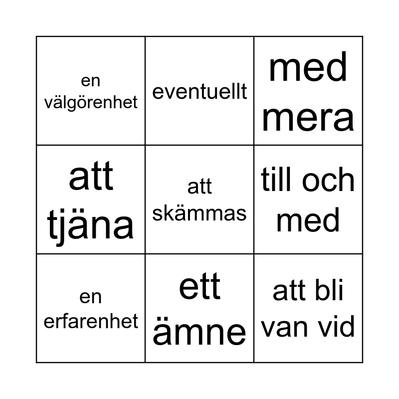 This bingo card has a free space and 8 words: till och med, med mera, eventuellt, en erfarenhet, en välgörenhet, att bli van vid, att tjäna and ett ämne.