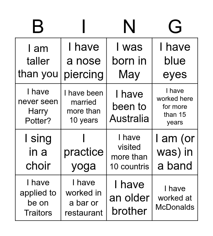 This bingo card has 51 words: I have never had covid, I have applied to be on Traitors, I don't have a pet, I don't have Facebook, I get up before 6am, I am a twin, I have a nose piercing, I have an allergy, I have been married more than 10 years, I have been on TV, I have been to Australia, I have blue eyes, I have lived abroad, I have met a celebrity, I have more than 3 tattoos, I have participated in a public performance, I have worked here for more than 15 years, I have worked in a bar or restaurant, I am a middle child, I have never seen Harry Potter?, I am (or was) in a band, I am left handed, I am taller than you, I sing in a choir, I am wearing a watch, I play on a sports team, I practice yoga, I prefer tea to coffee, I have the same first initial as you, I was born in May, I started at DGS this year, I was born in the same month as you, I like gardening, I have been sailing in the past year, I am a Gemini, I have been to 3 continents, I have won a comptetion, I wear contact lenses, I have never broken a bone, I can curl my tongue, I have an older brother, I have worked at McDonalds, I have been to the circus this year, I have done jury service in the past, I have seen Sam Fender live, I have been to a mathc at the stadium of light, I have visited more than 10 countris, I have been on a cruise, I have travelled on Eurostar, I bake bread regularly and I have been wild swimming.