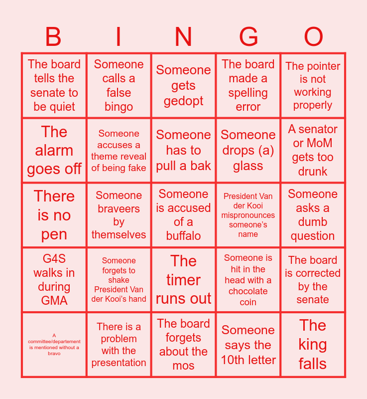 This bingo card has 30 words: There is a problem with the presentation, A department is misnamed as a committee, Someone braveers by themselves, The presentation screen falls over when someone walks in/out, The board tells the senate to be quiet, Someone gets gedopt, Someone accuses a theme reveal of being fake, The timer runs out, President Van der Kooi mispronounces someone’s name, The board forgets about the mos, Someone asks a dumb question, Someone is accused of a buffalo, Someone says the 10th letter, The king falls, A senator or MoM gets too drunk, The management selfhypes, Someone is hit in the head with a chocolate coin, G4S walks in during GMA, Someone forgets to shake President Van der Kooi’s hand, The pointer is not working properly, There is no pen, A board member forgets to take off their “penning”, Someone calls a false bingo, Someone drops (a) glass, The alarm goes off, The board made a spelling error, The board is corrected by the senate, A committee/departement is mentioned without a bravo, Someone has to pull a bak and MoM Kok tells a joke.