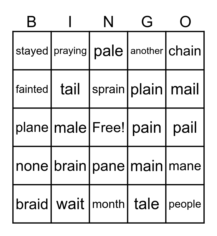 This bingo card has a free space and 24 words: brain, wait, sprain, braid, chain, stayed, fainted, praying, pain, pane, plain, plane, main, mane, tail, tale, pail, pale, mail, male, people, none, another and month.