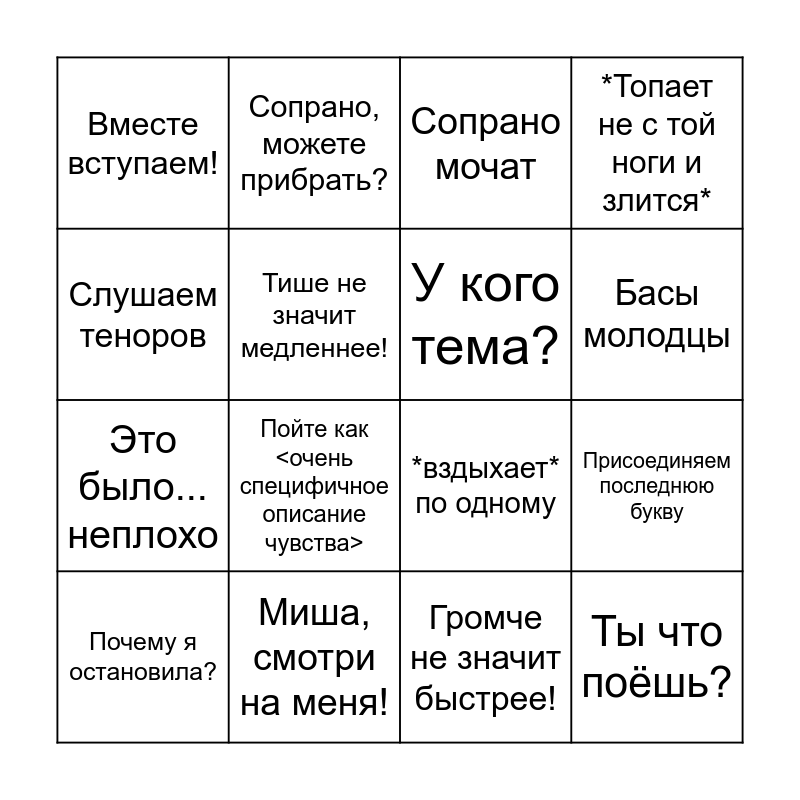 This bingo card has 50 words: *Вычурно пародирует плоское пение*, Почему я остановила?, Ну мы же академический хор?!, Слушаем басов, *Останавливает на первой минуте", Альты, можете прибрать?, Сопрано, можете прибрать?, Альты молодцы, Тише не значит медленнее!, Тенора молодцы, У кого тема?, *Топает не с той ноги и злится*, О чём эта музыка?, *Удивлённо* О, мы повысили?, Слушаем сопрано, А можно сразу в ноту вступить?, Басы молодцы, Миша, смотри на меня!, *грустит*, Слушаем теноров, Присоединяем последнюю букву, *Делает вид, что протягивает канат*, Вместе вступаем!, Это было... неплохо, Это же не высоко!, Не вместе!, Пойте как <очень специфичное описание чувства>, Опять всё по слогам!, Сопрано мочат, ДААААА!, Очень тонко, очень легко!, *машет руками как бешеная*, Округлите! *показывет рукой картошку*, Сопрано молодцы, *Резко прерывает песню* НЕТ!!!, ЛЕГАТО, ЧЁРТ ВОЗЬМИ!, Делаем фразу!, *Делает, как змея, чтобы хор делал фразу*, Вам что, высоко?, Громче не значит быстрее!, Смотрите на меня!, Вместе снимаем!, Не буду останавливать, Басы, можете прибрать?, Тенора, можете прибрать?, *вздыхает* по одному, Хорошо! Вот так пойте!, Кто здесь главный?, Ты что поёшь? and Слушаем альтов.