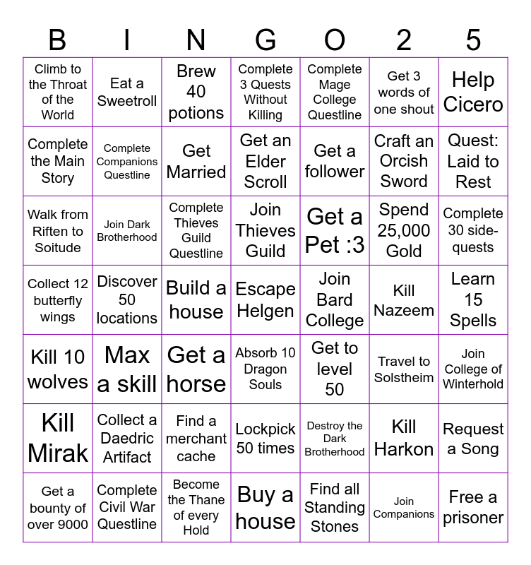 This bingo card has a free space and 48 words: Destroy the Dark Brotherhood, Craft an Orcish Sword, Buy a house, Discover 50 locations, Complete Thieves Guild Questline, Learn 15 Spells, Eat a Sweetroll, Complete Civil War Questline, Get 3 words of one shout, Absorb 10 Dragon Souls, Help Cicero, Complete 3 Quests Without Killing, Spend 25,000 Gold, Get a Pet :3, Kill Mirak, Kill Nazeem, Complete the Main Story, Quest: Laid to Rest, Kill Harkon, Complete Mage College Questline, Get a follower, Build a house, Climb to the Throat of the World, Complete Companions Questline, Request a Song, Get Married, Complete 30 side-quests, Get a bounty of over 9000, Join Thieves Guild, Join Dark Brotherhood, Join Companions, Join Bard College, Join College of Winterhold, Collect a Daedric Artifact, Collect 12 butterfly wings, Get to level 50, Travel to Solstheim, Walk from Riften to Soitude, Get a horse, Find a merchant cache, Kill 10 wolves, Free a prisoner, Brew 40 potions, Become the Thane of every Hold, Get an Elder Scroll, Lockpick 50 times, Max a skill and Find all Standing Stones.
