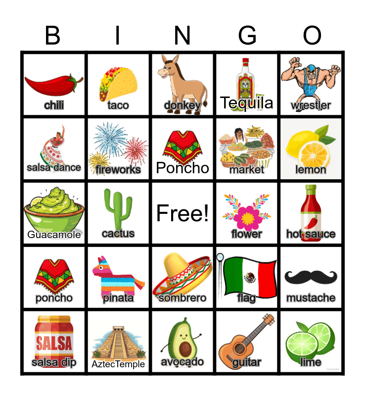 This bingo card has 31 images, a free space and 31 words: avocado, bunting, cactus, chihuahua, chili, donkey, fireworks, flag, flower, guitar, hot sauce, lime, maracas, margarita, lemon, mariachi, mustache, pinata, poncho, sombrero, wrestler, skull, salsa dip, taco, market, salsa dance, Tequila, Guacamole, AztecTemple, Poncho and Chocolate.
