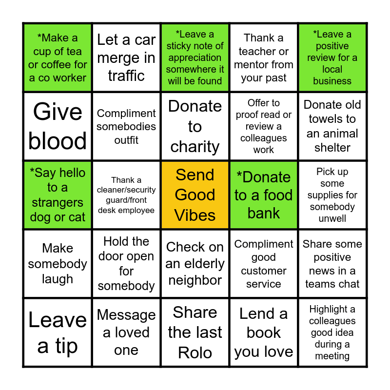 This bingo card has a free space and 24 words: Hold the door open for somebody, Message a loved one, Donate to charity, Leave a tip, *Leave a positive review for a local business, *Make a cup of tea or coffee for a co worker, Give blood, Let a car merge in traffic, *Donate to a food bank, Check on an elderly neighbor, Offer to proof read or review a colleagues work, *Say hello to a strangers dog or cat, Compliment good customer service, Share some positive news in a teams chat, Compliment somebodies outfit, Lend a book you love, Pick up some supplies for somebody unwell, *Leave a sticky note of appreciation somewhere it will be found, Donate old towels to an animal shelter, Thank a cleaner/security guard/front desk employee, Highlight a colleagues good idea during a meeting, Make somebody laugh, Thank a teacher or mentor from your past and Share the last Rolo.