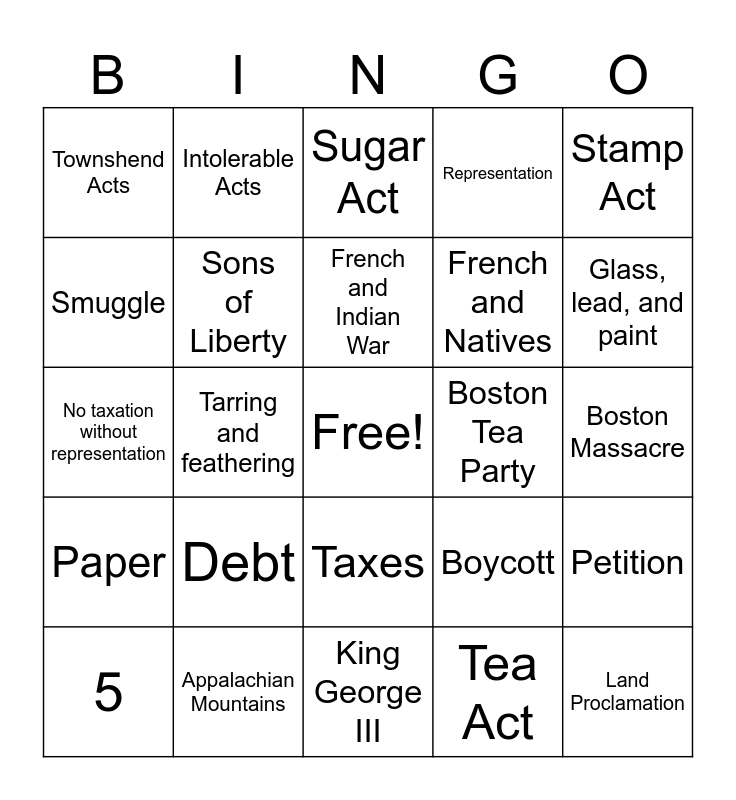 This bingo card has a free space and 24 words: 5, Debt, French and Indian War, Tea Act, Stamp Act, Townshend Acts, Intolerable Acts, Sugar Act, Boston Tea Party, Boston Massacre, No taxation without representation, Sons of Liberty, Boycott, Petition, Smuggle, Appalachian Mountains, King George III, Representation, Glass, lead, and paint, Paper, Tarring and feathering, Taxes, French and Natives and Land Proclamation.