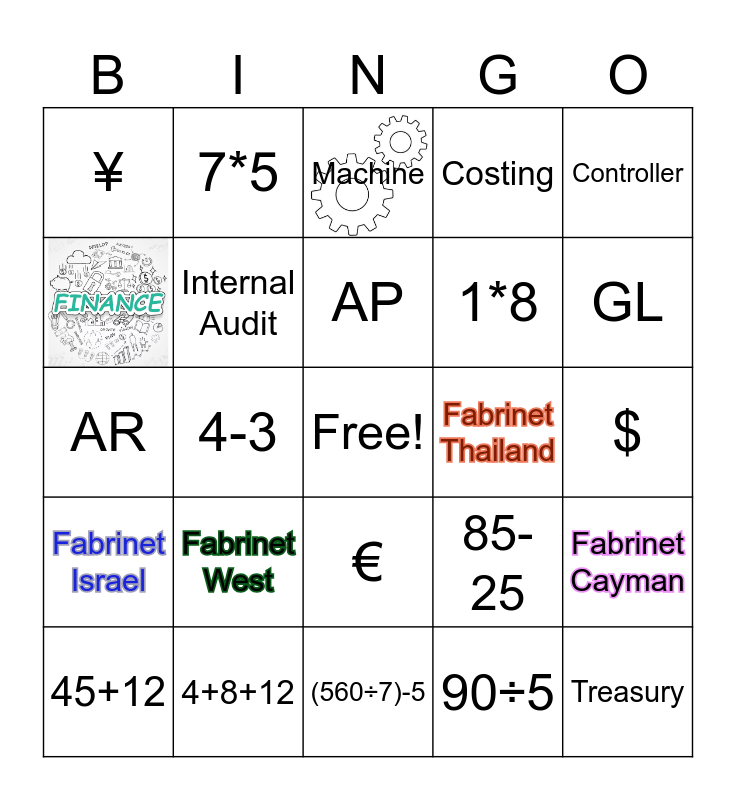 This bingo card has 2 images, a free space and 23 words: Fabrinet West, 4+8+12, AP, 45+12, Controller, ¥, 7*5, Fabrinet Thailand, €, 1*8, AR, 85-25, Fabrinet Cayman, Internal Audit, 90÷5, $, Machine, GL, 4-3, Treasury, Fabrinet Israel, Costing and (560÷7)-5.