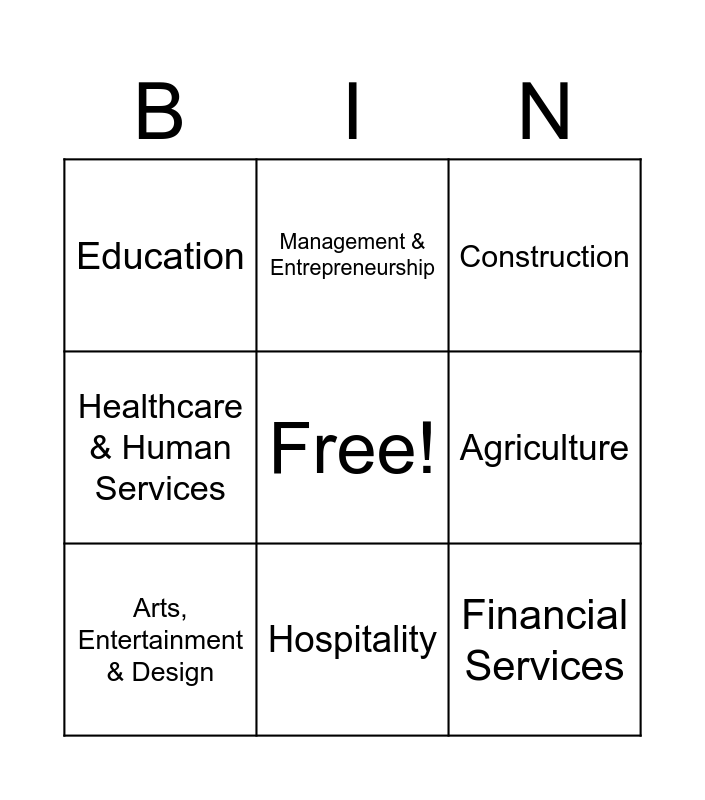 This bingo card has a free space and 8 words: Agriculture, Construction, Management & Entrepreneurship, Arts, Entertainment & Design, Education, Financial Services, Healthcare & Human Services and Hospitality.