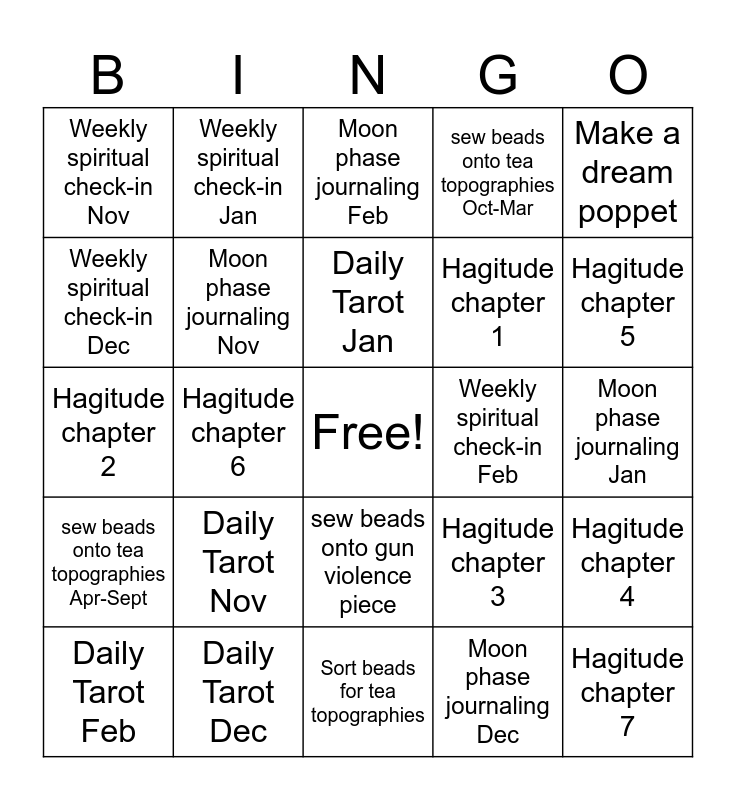 This bingo card has a free space and 24 words: Daily Tarot Nov, Daily Tarot Dec, Daily Tarot Jan, Daily Tarot Feb, Make a dream poppet, Weekly spiritual check-in Nov, Weekly spiritual check-in Dec, Weekly spiritual check-in Jan, Weekly spiritual check-in Feb, sew beads onto gun violence piece, Hagitude chapter 1, Hagitude chapter 2, Hagitude chapter 3, Hagitude chapter 4, Moon phase journaling Nov, Moon phase journaling Dec, Moon phase journaling Jan, Moon phase journaling Feb, Hagitude chapter 5, Hagitude chapter 6, Hagitude chapter 7, sew beads onto tea topographies Apr-Sept, sew beads onto tea topographies Oct-Mar and Sort beads for tea topographies.