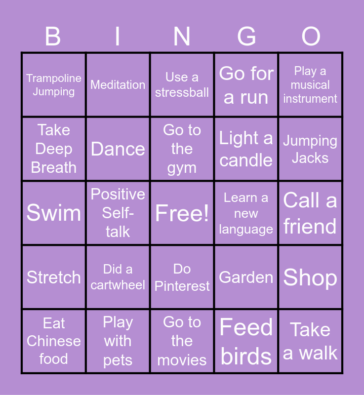 This bingo card has a free space and 54 words: Play a game with friends/family, Did a cartwheel, Stand on your head, Nap in the middle of the day, Call a friend, Journal, Dance, Paint your nails, Go for a run, Read a new book, Trampoline Jumping, Pilates, Feed birds, Shop, Ride a bike, Make a playlist, Go to the gym, Light a candle, Play with playdough, Eat Chinese food, Play with pets, Go to the movies, Learn a new language, Play a musical instrument, Yoga, Meditation, Do Pinterest, Cook, Clean your house, Knit/Sew, Put puzzle together, Take a bath, Watch fish, Play video games, Take Deep Breath, Paint, Use a stressball, Garden, Take a walk, Swim, Draw, Make hot cocoa, Rake Leaves, Give yourself a facial, Color with crayons, Go to the park, Fly a kite, Go for a long drive, Jumping Jacks, Stretch, Positive Self-talk, Sing, Rearrange furniture and Laugh.