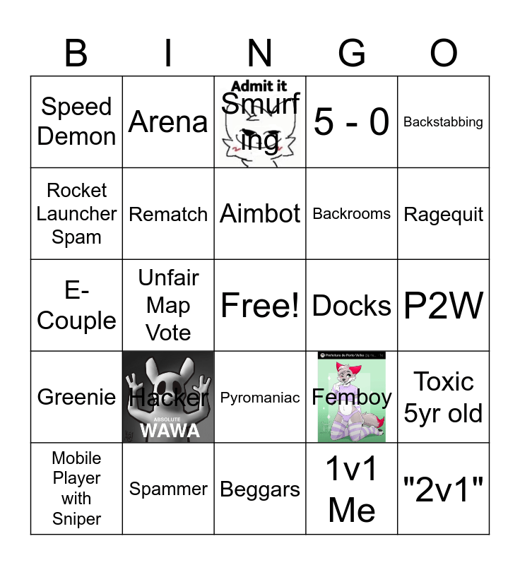 This bingo card has 3 images, a free space and 24 words: Hacker, Spammer, Aimbot, Mobile Player with Sniper, Backstabbing, Speed Demon, Rocket Launcher Spam, Arena, Docks, Pyromaniac, Backrooms, E- Couple, Femboy, Toxic 5yr old, Rematch, 1v1 Me, P2W, Smurf ing, Ragequit, Unfair Map Vote, "2v1", Greenie, 5 - 0 and Beggars.